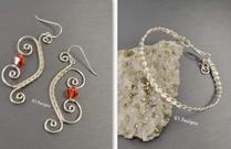 Hand bent wire and hammered metals jewelry, designs also incorporate leather, ceramic and wood materials